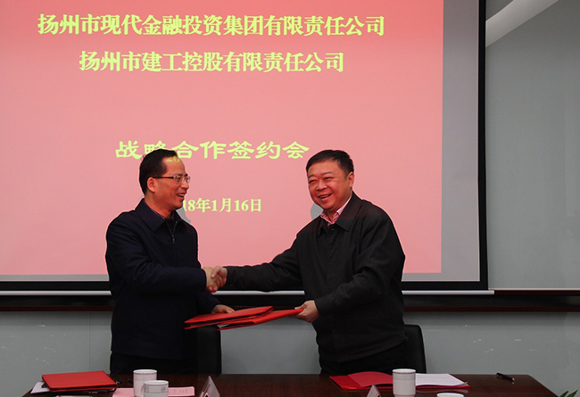 1月16日下午,揚州建工控股有限責(zé)任公司與揚州市現(xiàn)代金融投資集團有限責(zé)任公司(下稱“金融集團”)舉行戰(zhàn)略合作簽約會。公司董事長王宏、副總經(jīng)理程杰,金融集團董事長龔振志、總經(jīng)理劉研等出席簽約會。