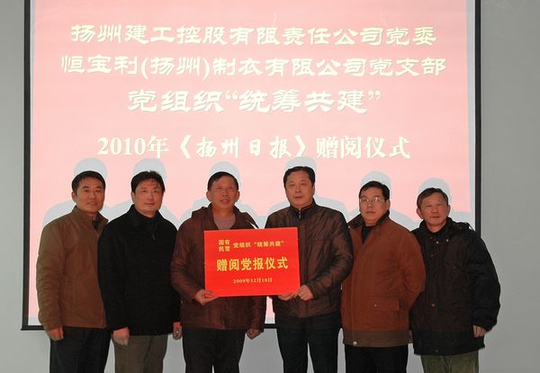系統(tǒng)黨委向統(tǒng)籌共建單位贈閱黨刊 時間:2009-12-227102 12月18日,建控公司黨委積極與外資企業(yè)恒寶利(揚州)公司黨支部開展國有民營黨組織“統(tǒng)籌共建”活動,向其贈閱了2010年《揚州日報》以及《黨章》等黨報黨刊學(xué)習(xí)資料,并與團員青年、入黨積極分子開展座談互動交流。