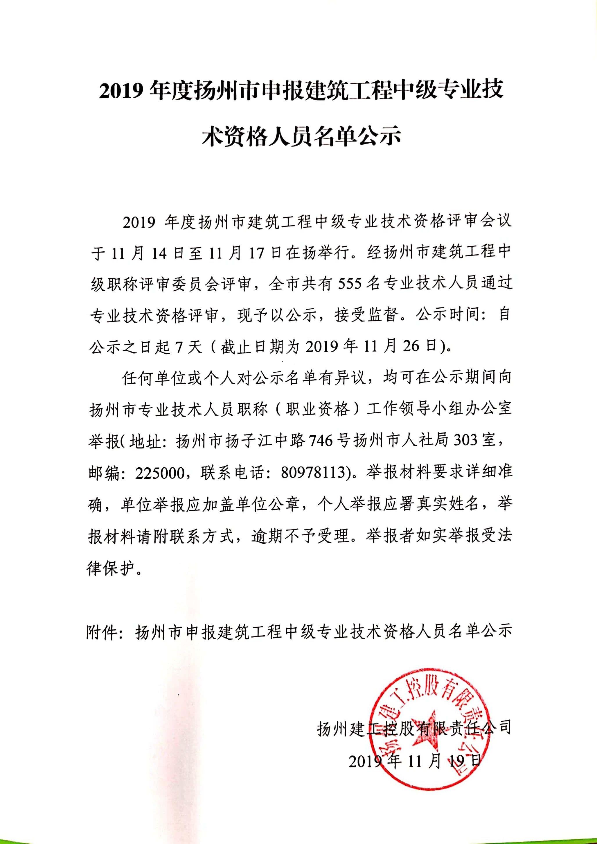 2019年度揚州市建筑工程中級專業(yè)技術(shù)資格評審會議于11月14日至11月17日在揚舉行。經(jīng)揚州市建筑工程中級職稱評審委員會評審,全市共有555名專業(yè)技術(shù)人員通過專業(yè)技術(shù)資格評審,現(xiàn)予以公示,接受監(jiān)督。公示時間:自公示之日起7天(截止日期為2019年11月26日)。